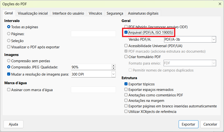 Passo 4 - Clique em Arquival (PDF/A, ISO 19005).