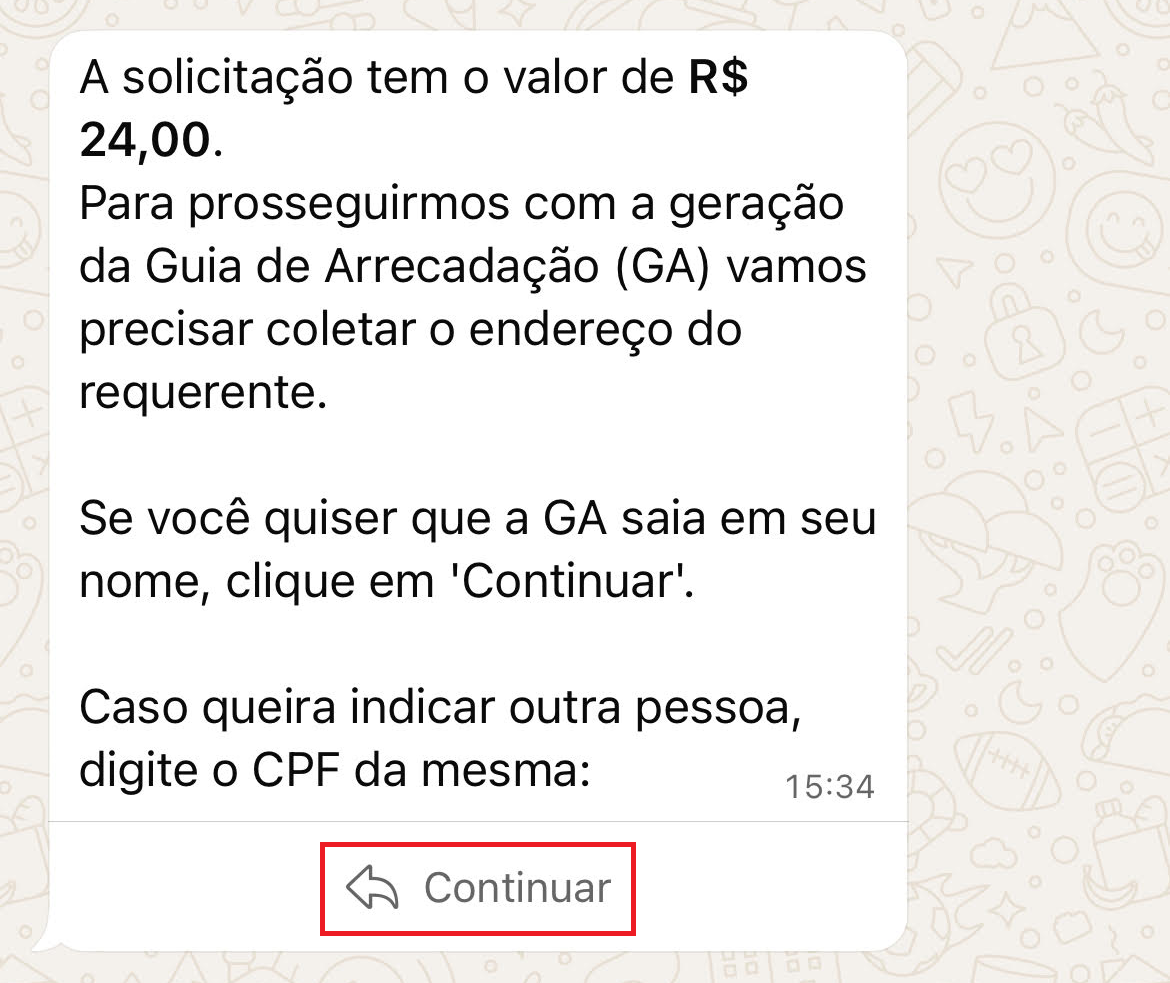 Passo 7 - Clique em Continuar para emitir o boleto deste serviço em seu nome. Ou digite o CPF da pessoa em nome da qual será emitido o boleto.