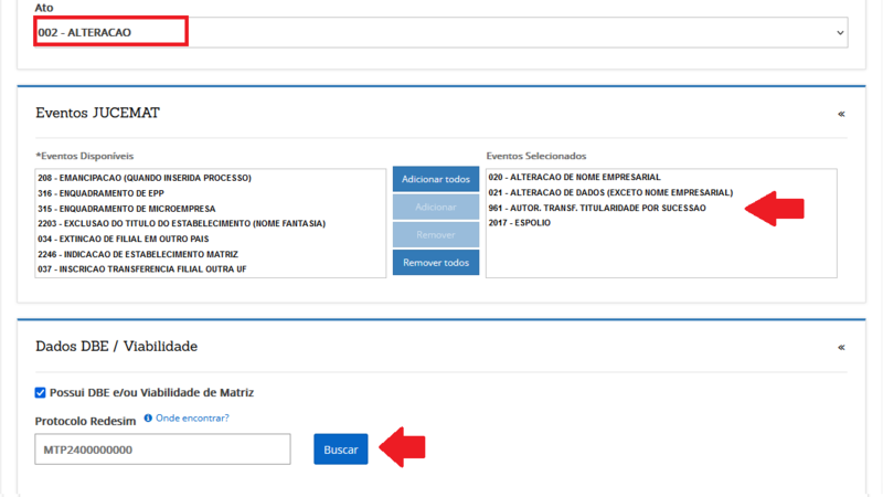 Escolha o ATO 002 EVENTOS - 2017 (ESPÓLIO), 961 (AUTOR. TRANSFERÊNCIA TITULARIDADE POR SUCESSÃO), 020 (ALTERAÇÃO DE NOME) & 021 (ALTERAÇÃO DE DADOS) e outras alterações se desejar.